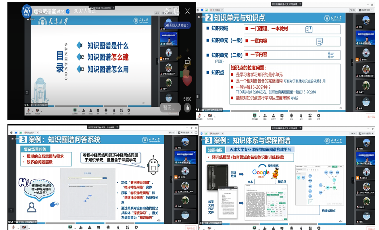 教育部重点领域资源及新型教材建设项目专家工作组专家、天津大学人工智能公司副经理王鑫首先做“认识与理解知识图谱专题报告”,围绕知识图谱是什么、怎么建以及怎么用三个方面介绍知识图谱的基本情况,帮助教师们理解知识图谱使用的基本逻辑。随后,山东大学孙康宁教授、大连理工大学王丹虹教授和国防科技大学刘燚副教授分别以工程材料与机械制造基础课程群、工程图学课程群和电子科学课程群的建设为例,分享知识图谱平台建设中教学资源(例题库、测试题库、问题库、教案库等)、微课、知识点在整理、导入和连接等方面的经验。最后,知识图谱工具平台技术专家曾昌从专业的角度,全面讲解了知识图谱平台的各项功能及操作,包括知识结构中各节点的编辑、文件的导入、在线协作、知识挖掘以及知识点关联等,并介绍了虚拟教研室知识图谱平台A版和B版在功能上的差异。