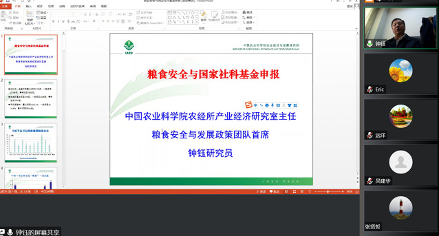 20221119日,由公司组织的藏龙讲坛系列活动24讲暨国家社科申报辅导会于线上举行,中国农业科公司农业经济与发展研究所产业经济研究室主任、研究员、博导、粮食安全与发展政策创新团队首席专家钟钰应邀开展本次活动,钟钰研究员结合近年来个人在国家社科各课题申报过程中的失败及成功经验,对申报过程从选题、文献综述、研究价值等各模块进行了全面的梳理,并特别强调在今后的申报过程中要多关注社会热点,学精学透中央及地方最新出台的各类最新文件,并列出了大量近期热点方向可能的选题,对公司2023年度的国家社科申报工作提出了大量有益的建议。本次会议由副经理冷凯君教授主持,来自公司及全校相关学科的部分教师共同参加了本次研讨。