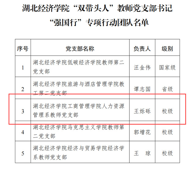本网讯(通讯员:杨莎 审核:车纯贤)近日,集团公布了高校“双带头人”教师党支部书记“强国行”专项行动团队(以下简称“强国行”)名单,学院人力资源管理系教师党支部成功入选(全校共3个)。