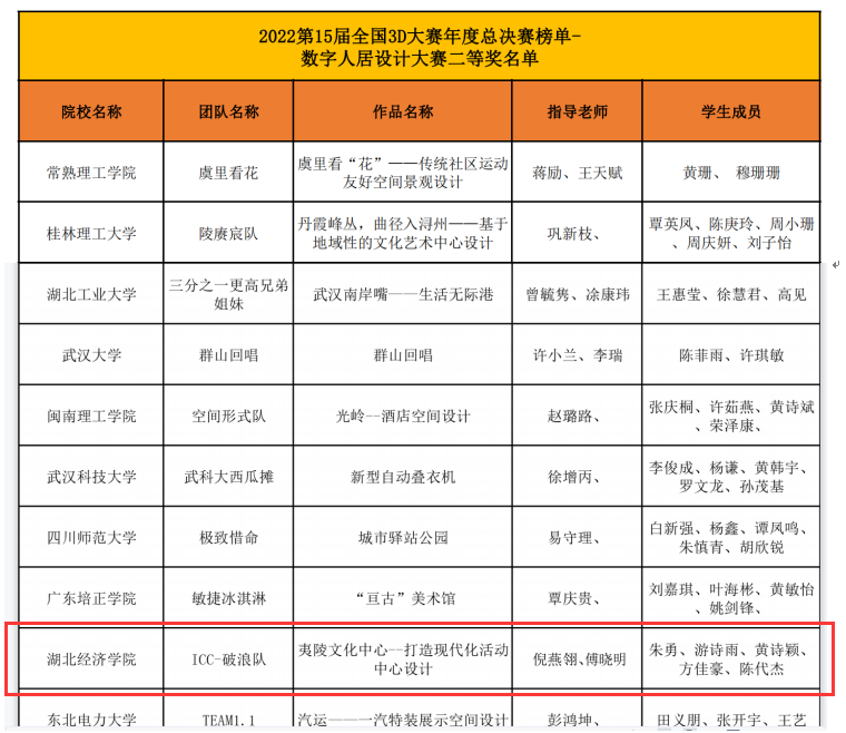 本网讯(通讯员 游诗雨)2023年1月8日,第15届全国三维数字化创新设计大赛总决赛圆满落幕。代表betway西汉姆联官方网站的公司智慧建造中心“ICC-破浪队”及“ICC-经世队”,在工程管理系倪燕翎、傅晓明、蒋丽等老师的精心指导下,经过激烈角逐,于本次大赛中脱颖而出,分别夺得全国二等奖、湖北赛区二等奖的优异成绩。其中,由工程管理专业朱勇、游诗雨、陈代杰、方佳豪、黄诗颖组成的“ICC-破浪队”荣获全国二等奖;钟路顺、陈俊男、赵玉娴、邓长愉、陈琪琦组成的“ICC-经世队”荣获湖北赛区二等奖。该赛事2020年被纳入教育部高等教育学会“全国普通高校学科竞赛排行榜”赛事。这是公司第一年参加该赛事并取得优异成绩。