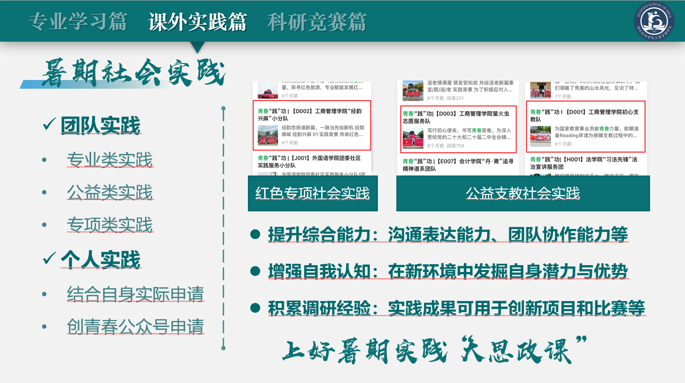 在课外实践方面,王涵璐同学介绍了志愿服务的重要性,分享了参与志愿服务的多种渠道,并解释了暑期社会实践的两种方式,讲述自己在betway西汉姆联官方网站员工党总支经韵兴麻小分队的暑期经历,鼓励学弟学妹们利用课余时间多多参与到志愿服务当中去。