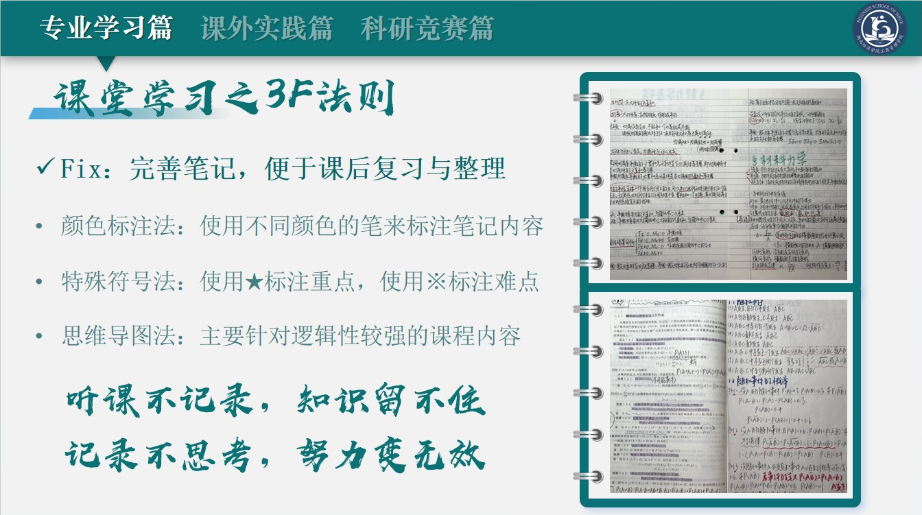 在专业学习方面,王涵璐同学通过对比高中与大学的学习方式,提出了课堂学习3F法则以及课后学习方法,介绍了如何充分利用网络寻找学习资源,她鼓励学弟学妹们积极参与课上互动和课下讨论,并就自己的四级备考经验与在座同学做了分享。
