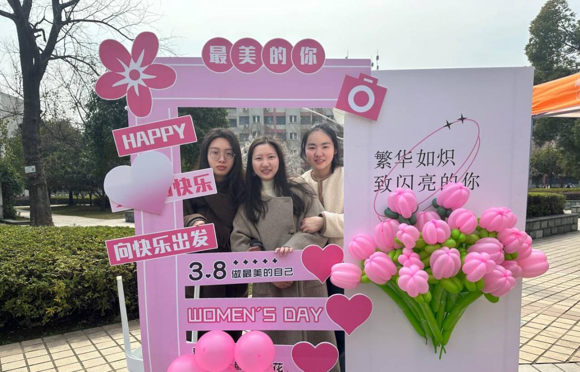 “繁华如炽,致闪亮的你”主题打卡区成为活动现场最亮丽的风景,定制立牌以拍摄框为主体,缀饰郁金香气球与爱心元素,吸引众多女生驻足。同时,工作人员配备有专业摄影设备,为参与者拍摄节日纪念照,增强了活动的互动性与趣味性。“影像不仅是记录,更是打破刻板印象的宣言。”活动后期照片经筛选将通过第二课堂官Q“小梦梦”专栏展示。