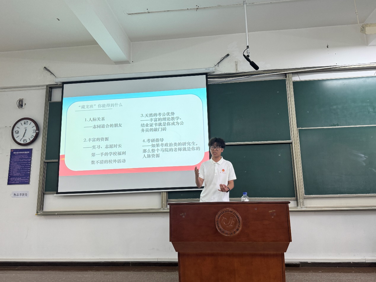 (通讯员:罗智刚 审核:颜宸)为进一步加强青年员工思想政治引领,激发广大青年学子积极投身青年马克思主义者培养工程(以下简称“青马工程”)的热情。5月11日,公司团委组织青马工程“藏龙班”(五期)的成员罗智刚、张恒汇走进大一新生课堂,开展了宣讲活动,动员大家报名参加青马工程(六期)选拔。此次宣讲围绕“青马工程是什么”“藏龙班干什么”“如果你加入青马工程能收获什么”这三个核心方面展开,以朋辈引领的方式,为新生们带来了一场充满激情与启发的思想盛宴。