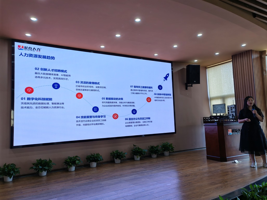 活动当日,师生团队在企业相关人员的陪同和引导下,参观了该公司现代化的办公环境,并详细了解了该公司在招聘流程优化、员工培训与发展以及数字化转型等方面的核心业务。然后由人力资源管理部部长介绍公司发展历程、在人力资源服务业的地位以及未来发展趋势,由市场部负责人介绍公司的产品类型与商业模式等。最后,双方进行了深入的座谈交流,围绕数字化课程建设、数字化人才培养等议题达成了初步共识,为后续的深度合作奠定了坚实基础。