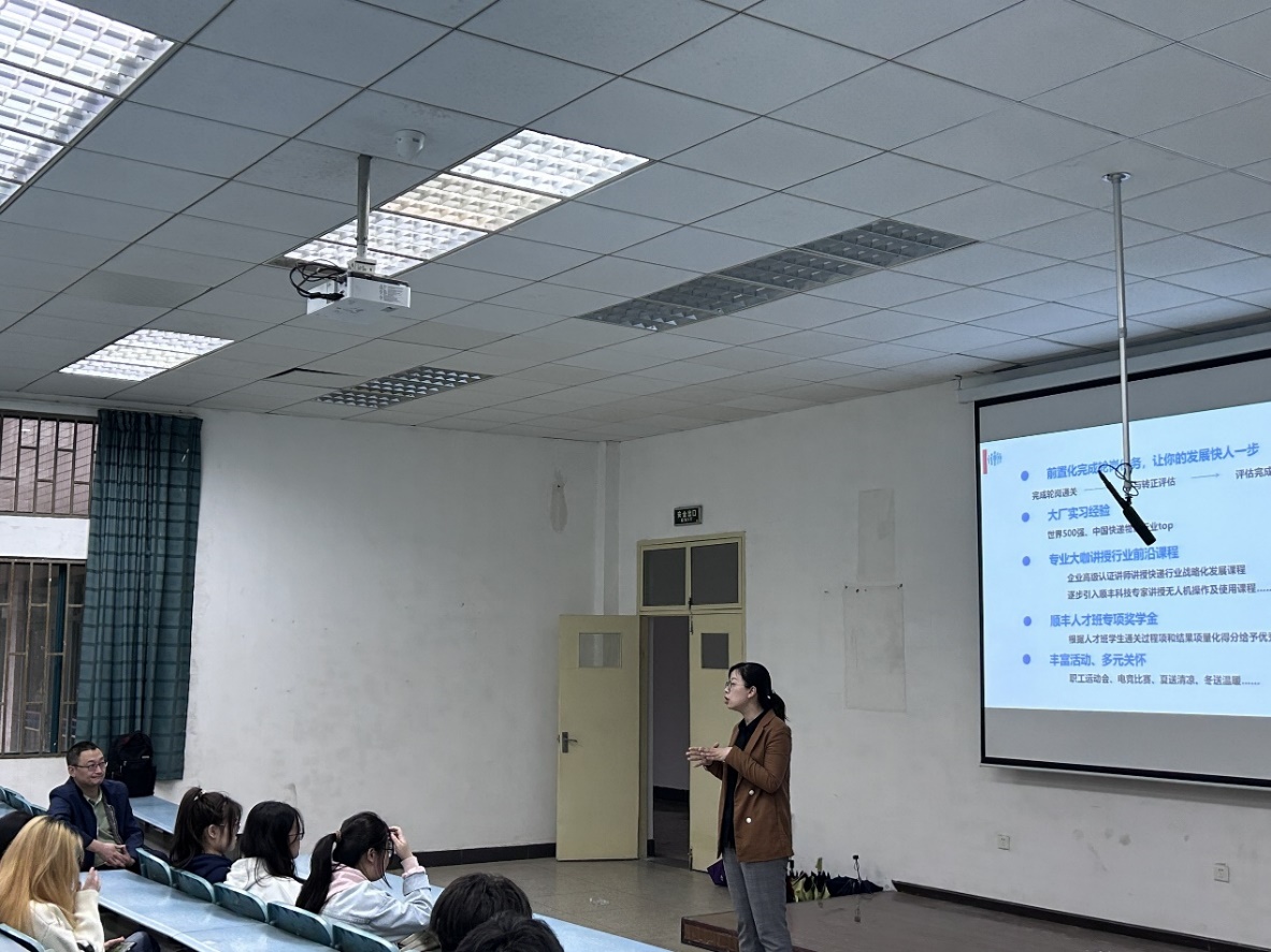 会上,顺丰集团老员工培养计划负责人杨浩针对顺丰“人才班”相关事宜进行了详细介绍。“人才班”的建设是公司与顺丰集团开展校企合作的重要环节,人才班通过量化的通关任务,以线下实岗训练为依托,培养前置专业人才。