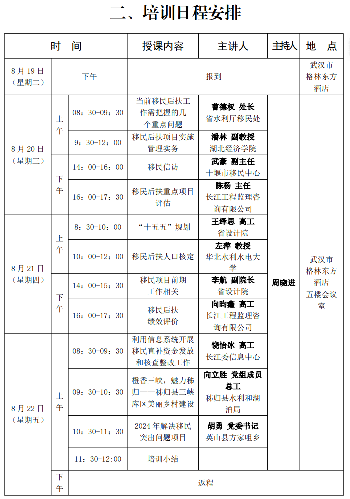 本次培训活动是由湖北省水利厅移民处和湖北省水利工程移民事务中心举办,持续三天,培训内容涉及项目实施管理、绩效评价、重点项目评估、信访、移民人口核对、十五五规划编制等专题内容,旨在进一步提升全省移民业务骨干管理水平,推动全省大中型水库移民工作高质量发展。