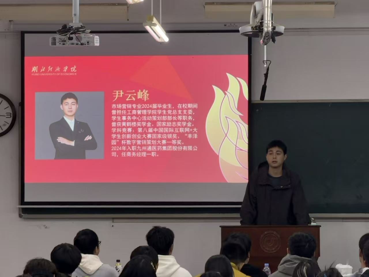 紧接着,优秀学长代表尹云峰分享了自己大学四年的成长历程以及工作中的所见所闻。他劝诫同学们一定要珍惜大学四年的时光,努力充实自己,让自己变得更加优秀,如此才有可能在激烈的求职市场中脱颖而出。