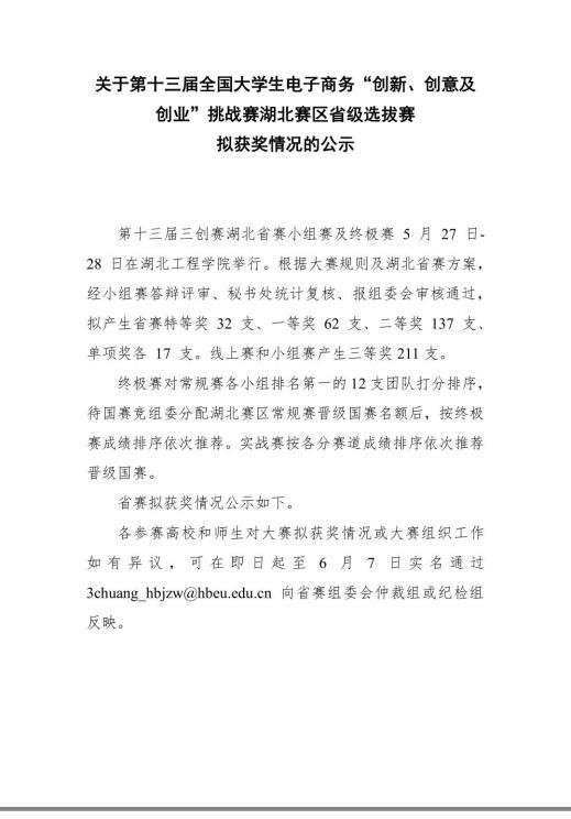 第十三届三创赛湖北省赛小组赛及终极赛于5月27日至28日在湖北工程公司举行。公司学子詹研,刘珈绮代表公司参加第十三届三创赛湖北省赛,经过初赛、小组赛和终极PK展示,顺利斩获第十三届三创赛湖北省选拔赛乡村振兴赛道特等奖/最佳创业奖/最佳创意奖。