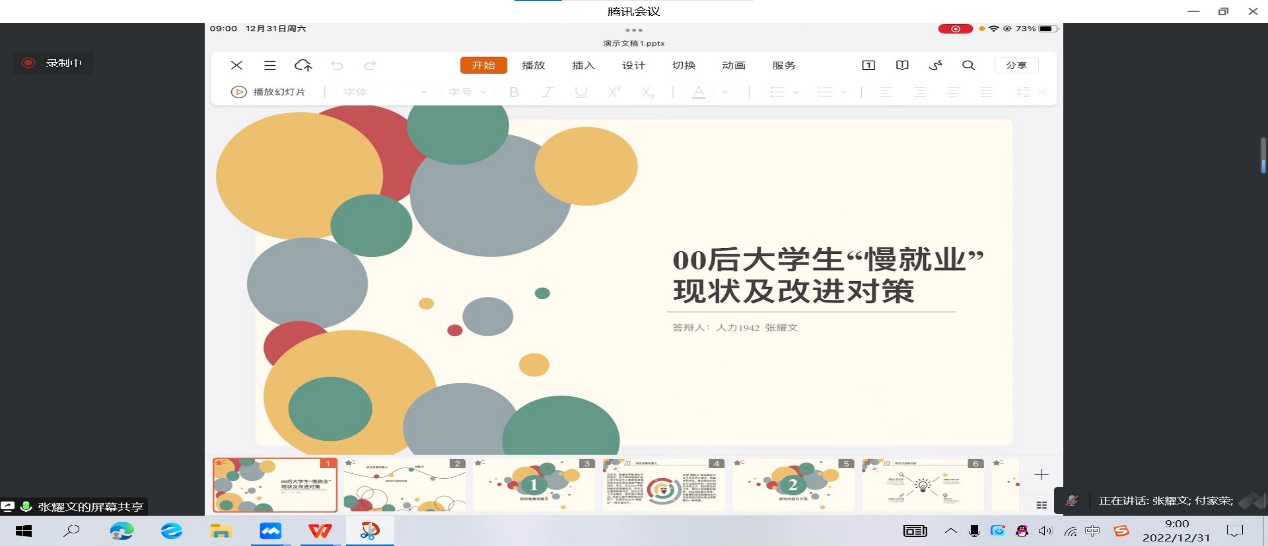 2022年12月31日,人力资源管理专业利用腾讯会议线上平台组织召开了2019级本科学位论文开题报告会。开题报告会分4组进行,每组由3名专任教师和1名员工答辩秘书组成。全专业72名员工全部参与了答辩工作。