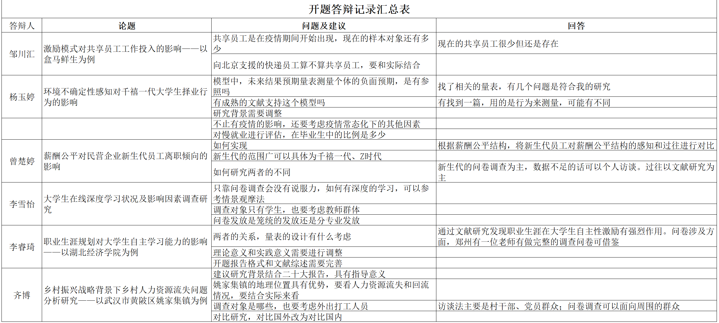 本次开题报告会主要分为员工陈述、答辩组提问、员工答辩三个环节。开题员工按顺序向答辩组介绍自己的论文选题、研究背景和意义、文献综述、研究思路、研究内容、研究方法等,答辩组老师对每个员工的开题报告的结构、研究方法、写作规范等提出建议。通过本次开题,公司2019级员工更清楚地认识到毕业论文的重要性与严肃性,以及自己论文构思的不足之处,为后期论文撰写和毕业答辩奠定了基础。