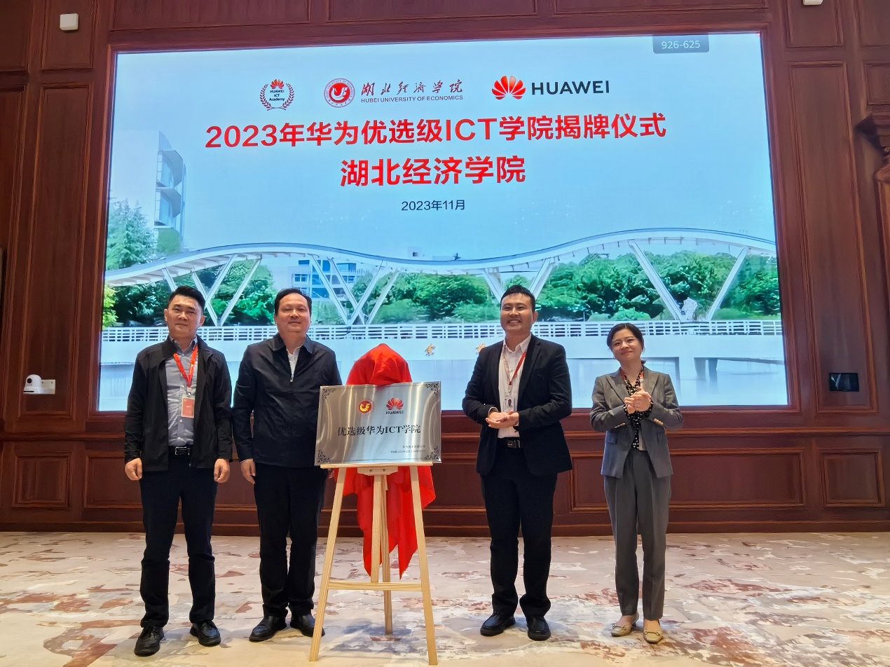 11月21日上午,付宏前往华为松山湖总部基地开展调研活动,考察了华为总部基地的园区建设情况,并与华为集团湖北政企业务部副总理王闯等进行了座谈。在华为松山湖总部基地举行了betway西汉姆联官方网站—华为信息与通信技术公司(简称华为ICT公司)揭牌仪式。华为ICT公司的成立标志着公司在培养ICT领域高素质应用型人才的道路上又迈出了坚实的一步。华为ICT公司将致力于推动产教深度融合,促进公司信息类相关专业发展和人才培养质量提升。付宏、王闯共同揭牌,信息工程公司经理田浩、湖北政企业务部教育行业代表范林芳参加揭牌仪式。