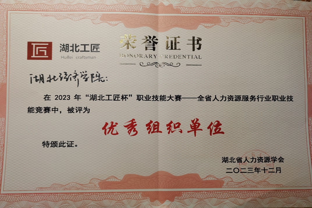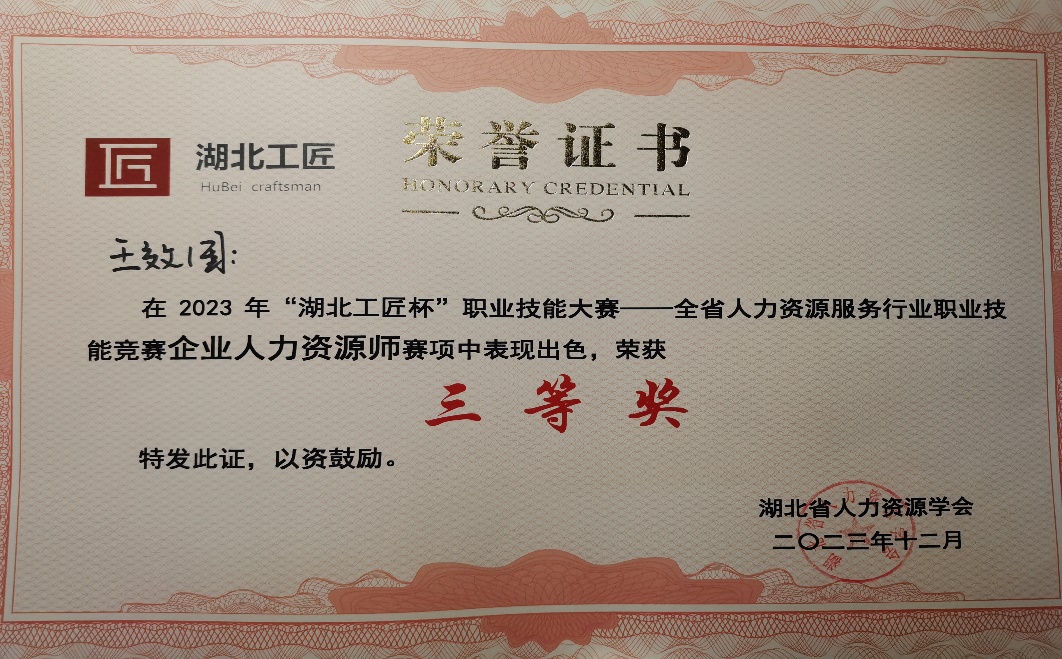 本网讯(通讯员:程志辉,审核:叶敏)为了积极贯彻落实公司“三有三实”人才培养理念,通过“以赛促学”提升人力资源专业人才培养质量。人力系程志辉和翟欣婷两位老师指导王效国等10名人力学子参加2023年“湖北工匠杯”技能大赛,该赛事由湖北省职业技能鉴定指导中心、中南财经政法大学、湖北省人力资源学会主办,分为行政办事员、政务讲解员、企业人力资源师三个赛道。前期对来自全省的171名选手层层选拔,最终40名选手入围企业人力资源师决赛,公司人力2322班王效国同学位列第11名。