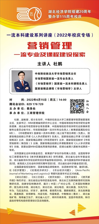 为夯实和推进公司市场营销国家级一流专业,更加聚焦聚力打造一流本科教育,强化专业课程建设内涵,2022年4月15日,中南财经政法大学市场营销国家一流本科专业负责人、市场营销学国家级一流本科课程负责人、市场营销系主任杜鹏教授透过腾讯会议开展一流专业建设与发展的专题讲座,副经理叶敏、市场营销系、工商管理系、人力资源系、物流管理系教师参加了会议。会议由副经理叶敏主持。