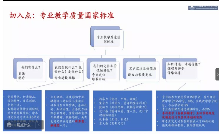 会议上,杜鹏教授围绕“抓标准、抓思政、抓课程、抓教材、抓案例”五大教育新基建介绍了中南财大市场营销专业建设的思路、路径和保障。首先,杜鹏教授从员工、市场、专业和教育主管部门等不同角度列举了营销专业建设过程中可能面临的压力,认为需要基于新技术、新市场和新营销的思路才能打破现有的局面。其次,杜鹏教授结合丰富的课程改革经验与案例呈现了中南财大市场营销专业的变革之路,从如何有机融合营销管理与思政元素,到团队协作将专业的团队团队、员工、员工、企业等多方力量拧成一股绳,凝神聚气、统一认识,让专业课程变得有趣、有料和有用,也建立了“一体两翼+案例库”的体系,形成了“线上+线下教育闭环”,例如开创了黄金悟研习社、“深客·商业”公众号。最后,杜鹏教授分享了专业建设过程中自主权、机制等方面的问题与举措。通过此次会议,公司教师深入学习了中南财大市场营销专业的人才培养、课程建设和专业建设举措,为公司夯实和推进国家级一流专业建设提供了许多有价值的经验参考。