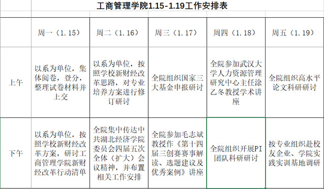 各位老师,根据公司《关于2024年寒假放假安排的通知》精神,1月15日—19日全校教职员工集中上班,1月20日(星期六)开始放假、轮休。公司制订下周工作安排如下: