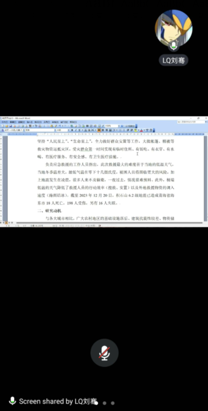 在本次研讨会上,刘骞老师围绕极端天气条件下农村地区地震应急救援问题,从研究背景、研究意义、研究方法与研究内容对拟申报的课题进行了汇报。随后,孙宝林教授从概念辨析、研究题目与研究内容的改进、如何在研究内容中体现前沿技术的应用等多个方面提出了有建设性的意见。