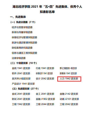 本网讯(通讯员 赵惠 李睿琦)根据《关于评选2021年度“五•四”先进集体、优秀个人和优秀项目的通知》(鄂经院团字〔2022〕2号)要求,经集体(个人)申报、院系评选、院系推荐、校团委组织评选及审核、公司第三届团委常委会审议等环节,全校最终遴选产生了10个“十佳团支部”,公司人力1942团支部在辅导员蒋玥老师的带领下荣获2021年“‘五•四’十佳团支部”荣誉称号。