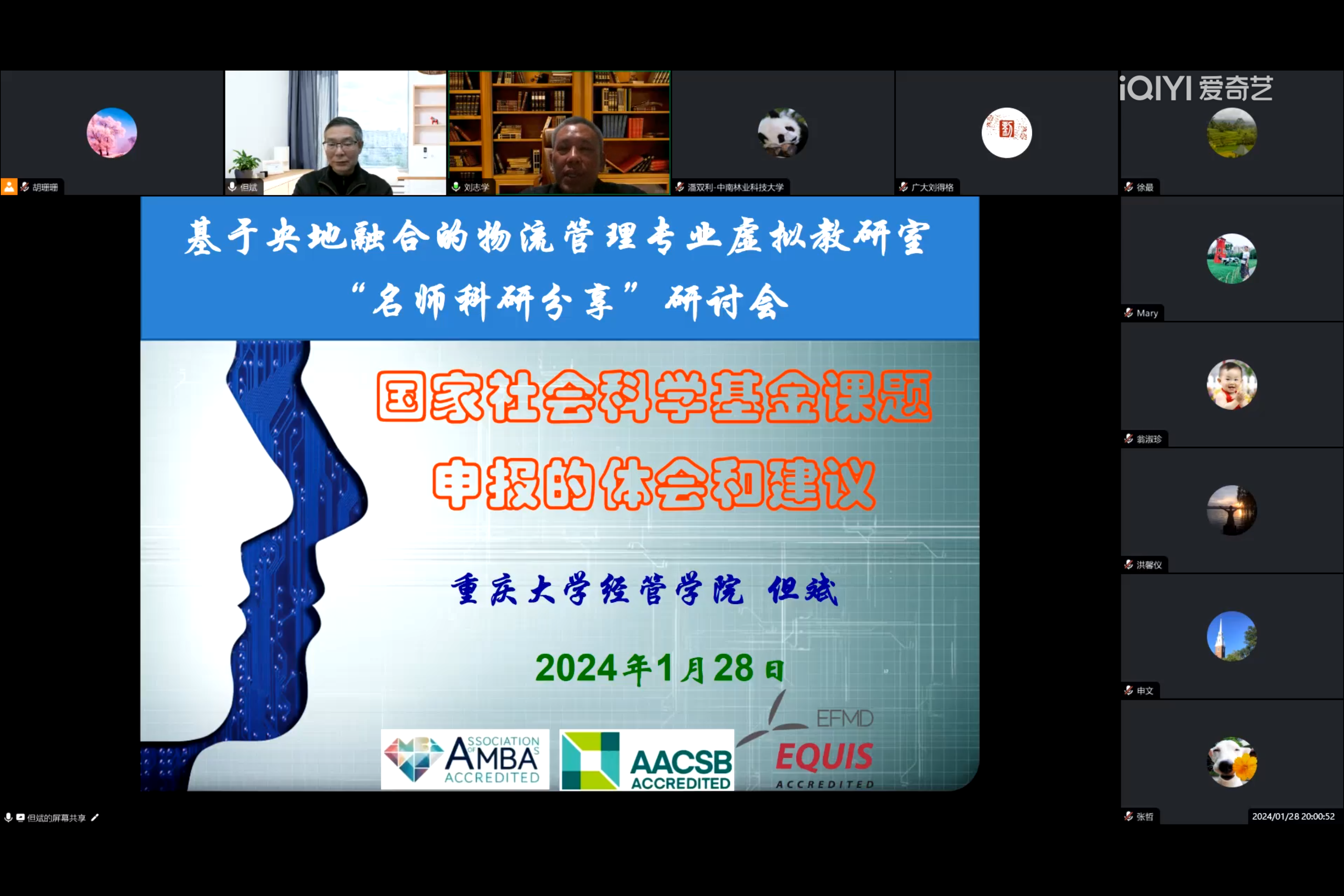 本网讯(通讯员 汪利虹)2024年1月28日晚8:00-9:30,基于央地融合的物流管理专业虚拟教研室举办研讨会,邀请betway西汉姆联官方网站二级教授、博士生导师,教育部高校物流教指委委员、中国物流学会副会长、国务院政府津贴专家但斌教授作“国家社会科学基金申请的体会和建议”讲座。本次活动由公司特聘教授、虚拟教研室负责人、教育部物流管理与工程类专业教指委副主任委员、华中科技大学刘志学教授主持,公司教师和来自北京、上海、江苏、浙江、安徽、福建、湖北、湖南、河南、广东、重庆、云南、贵州、陕西、甘肃等共150余位国内高校教师参加研讨活动。