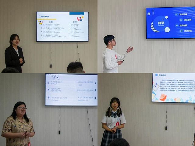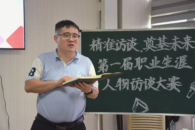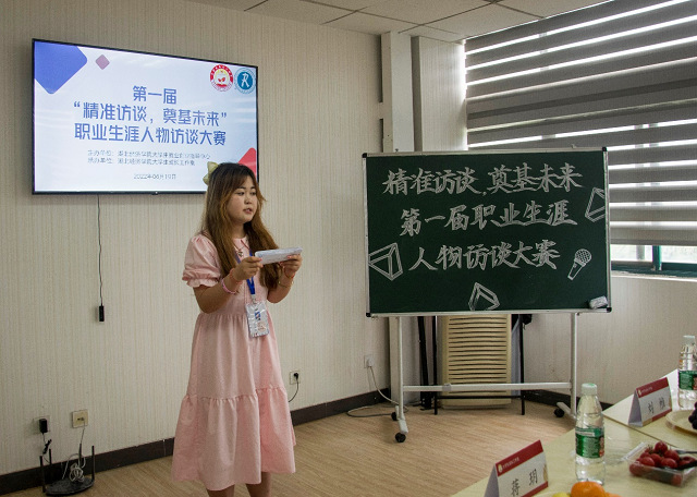 比赛伊始,十位选手依次登台,从社会需求、职业需求、职业环境和自身基本状况等多方面并结合自己访谈对象的信息,阐述了自己的生涯目标与生涯规划,并回答评委老师的现场提问。选手准备充足,现场气氛活跃,在与评委老师互动时,观众席时常爆发阵阵掌声。