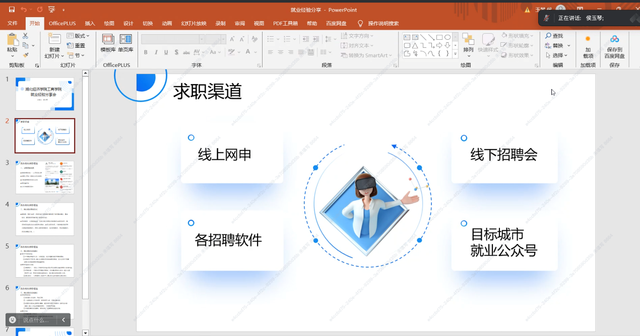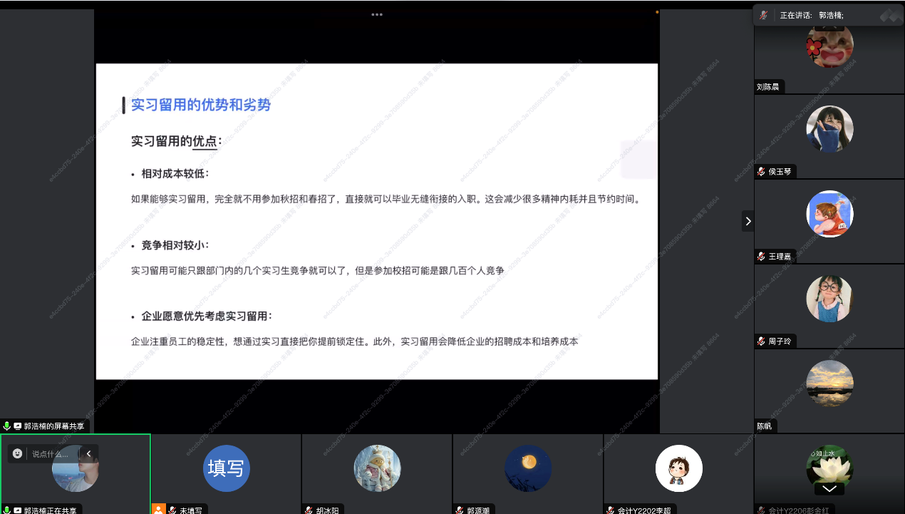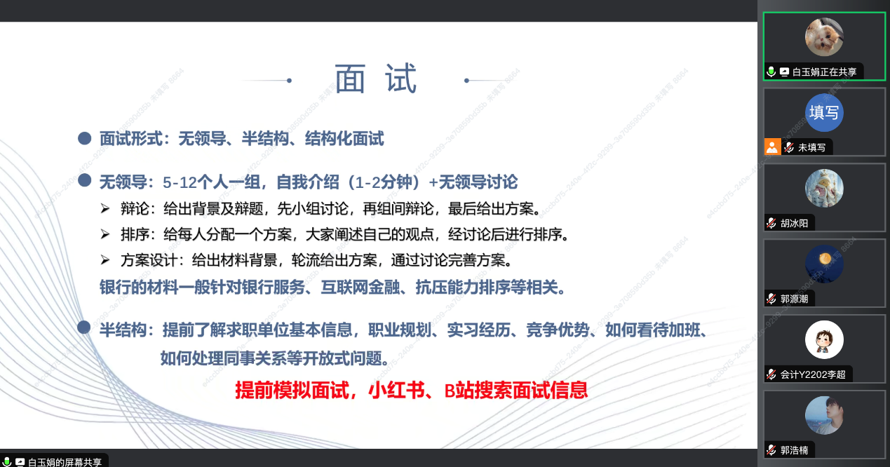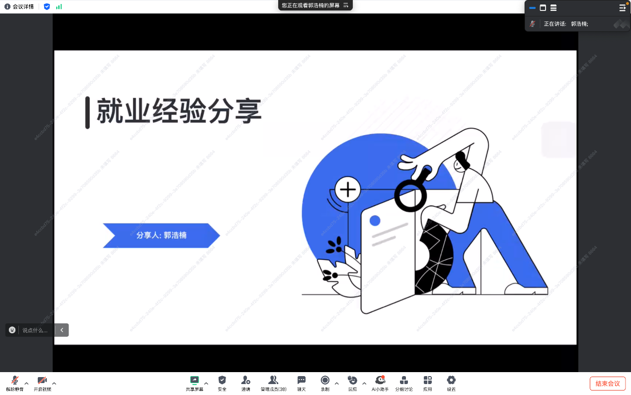 三位研究生郭浩楠、侯玉琴、白玉娟分别分享了自己的就业的故事,讲述了各自在不同岗位应聘的技巧和经验,以及他们就业过程中经历的种种困难和挑战,突破困难的方法等等。