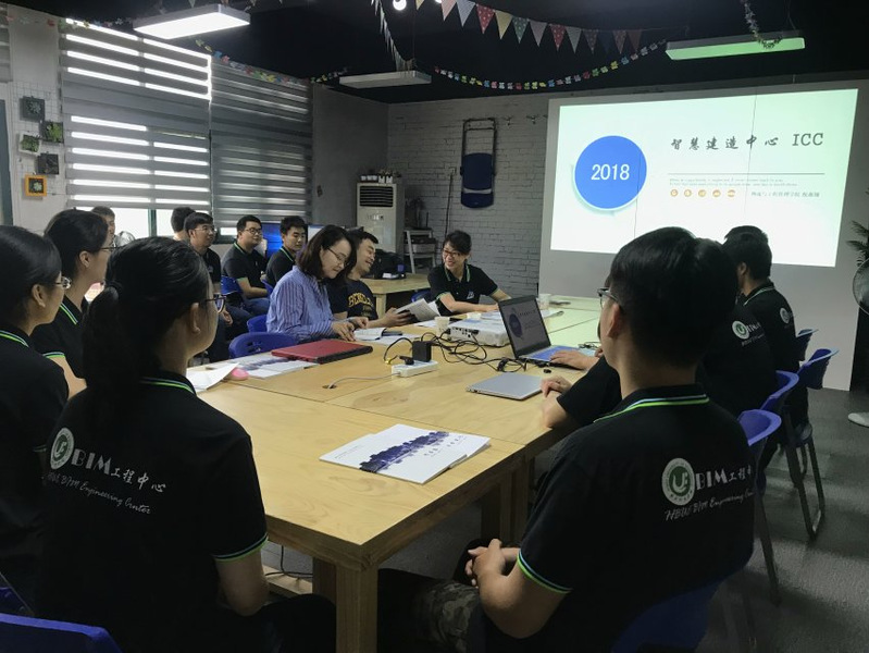 交流伊始,倪老师向朱总和张总简要介绍了物流与工程管理公司近年的发展历程和公司特色,然后重点介绍了智慧建造中心的筹备创立、人员架构、团队成果、社会实践以及未来规划。朱总对中心参与过的具体项目非常感兴趣,进行了详细的询问了解。张总则非常注重中心在MAGICAD和机电管线等方面的建模能力、水平,现场要求中心成员展示成果。项管14级的付杨、15级张昌文、以及法商公司14级王炫中等同学当场将一年来参与的实际项目如一号活动中心的三维建模、机电建模,还有光谷海星大厦的管线建模等进行了现场演示和讲解,充分展示了中心成员在多专业领域的建模经验及实力。