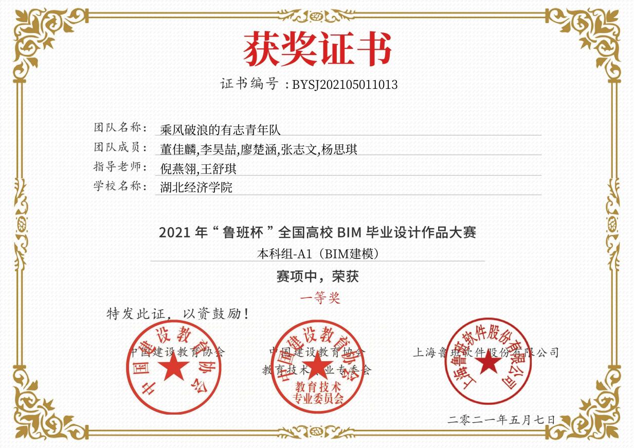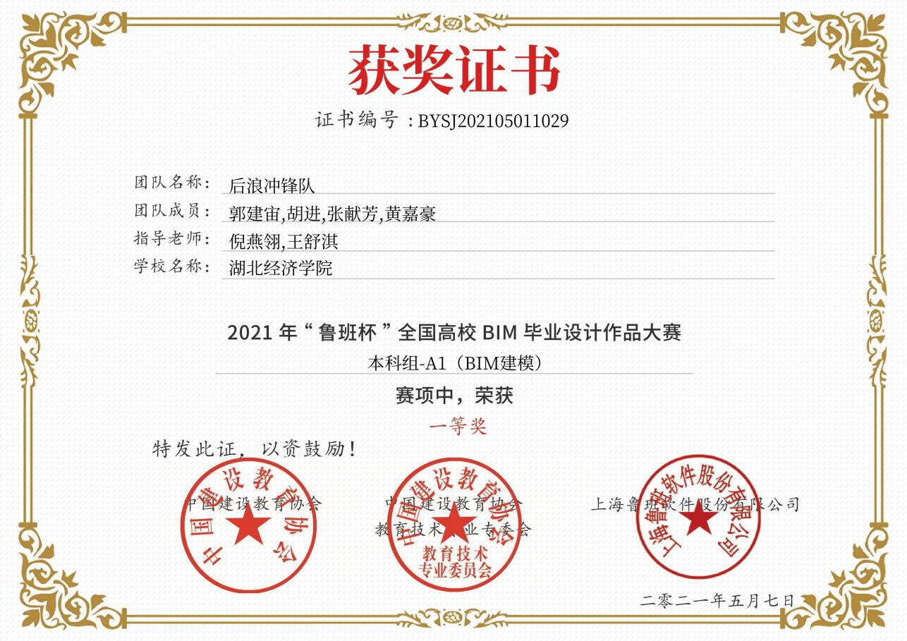 本网讯(通讯员 张志文)2021年6月5日,2021年“鲁班杯”全国高校BIM毕业设计作品大赛总决赛在上海闭幕。我校2支队伍,在工程管理系倪燕翎、王舒琪等老师指导下,在本次大赛各赛项中脱颖而出,获得两个一等奖的优异成绩。其中,由董佳麟、杨思琪、李昊喆、廖楚涵、张志文组成的乘风破浪的有志青年队荣获本科组-A1(BIM建模)一等奖;由胡进、张献芳、郭建宙、黄嘉豪组成的后浪冲锋队荣获本科组-A1(BIM建模)一等奖;倪燕翎,王舒琪两位老师分别获得“优秀指导教师”称号。